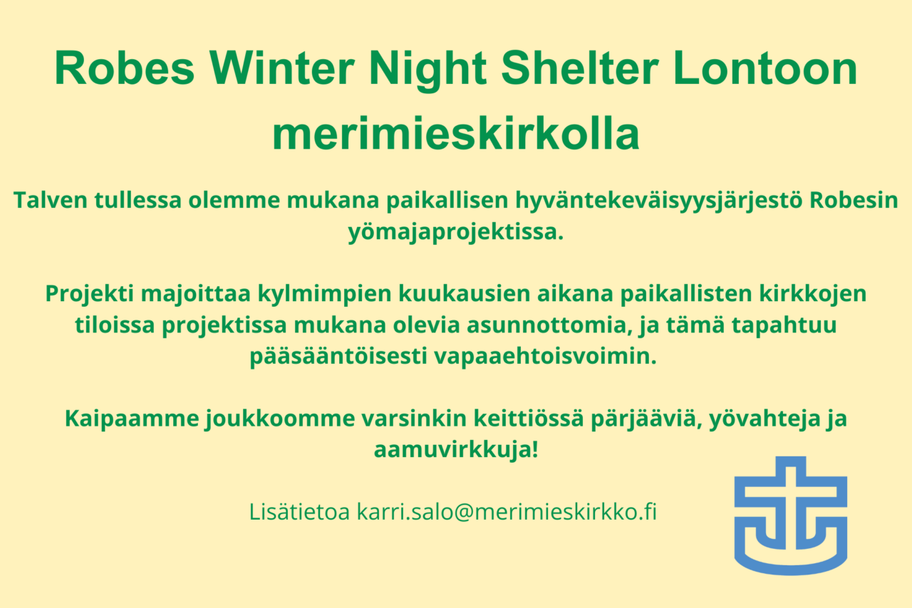 Lontoon merimieskirkko tarjoaa majoitusta, ruokaa ja suojaa 22.1.2026-5.3.2026 aikana, aina torstai-perjantai välisen yön.
